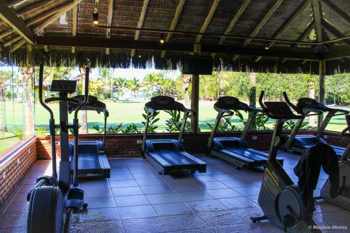 - Ir à academia: esse item é só pra quem já tem a malhação como um hábito no dia a dia e não quer sair da rotina. Muita gente não vai a academia nos fins de semana, e lógico que também não vai querer ir num resort. Mas lembre-se que, querendo ou não, o gasto calórico é grande e vai te permitir comer algo extra numa refeição, por exemplo, uma fatia de pudim (o do Portobello é inacreditavelmente delicioso). Alguns resorts têm academias incríveis e até professores para te ajudar nos exercícios. Porque não experimentar? Vale a pena. Eu sempre vou conhecer as academias dos resorts que fico até sem muita vontade de fazer algo e confesso que muitas vezes acabo me empolgando com o que vejo. A academia do Portobello fica de frente para um lindo jardim verdinho sempre bem ventilado.