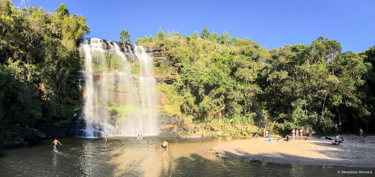 Em seguida, partimos para conhecer a Cachoeira da Mariquinha, que fica a aproximadamente 30km do centro de Ponta Grossa. Do Buraco do Padre pra lá, levamos quase 1h de carro. Aos pés da sua enorme queda d’água forma-se um balneário de rara beleza, perfeito para banhar-se como em uma praia de rio.