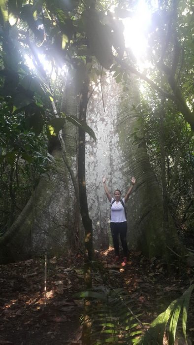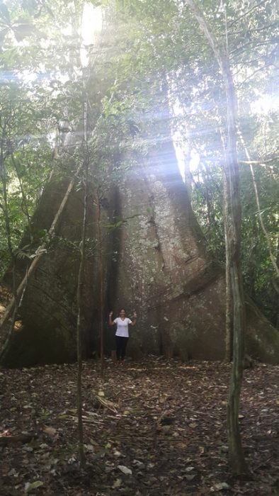 Apesar do clima super quente e úmido durante a caminhada, são poucos os trechos onde dá pra sentir o sol. A quantidade de árvores garante sombra por quase toda trilha. Leve bastante água porque o corpo pede muito nesse clima amazônico e uma fruta ou algo leve para comer. Durante o percurso nos deparamos com várias Samaúmas, todas elas impressionantes, mas nada se compara com a chegada à gigantesca, conhecida como Vovó. É impossível não se emocionar. A Vovó é aquela árvore que é preciso reunir umas 25 pessoas para abraçar seu tronco, mais de 1000 anos de vida e de uma beleza exuberante. Você tenta enxergar a copa da árvore mas é impossível, tamanha sua altura.