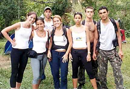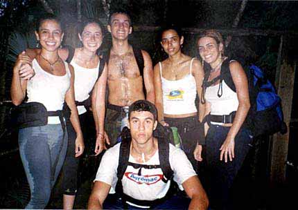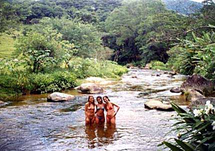 Caminhamos mais ou menos uma hora atravessando fazendas, e escorregando com frequencia no lamaçal que tinha se transformado o caminho, procurando a trilha inicial, passamos por uma cabana de sapê e resolvemos descansar um pouco, mas como o lugar era muito rústico e mal iluminado, as meninas ficaram com medo de ficar ali e resolvemos continuar andando, logo depois encontramos a trilha principal e continuamos a viagem até encontrarmos Luizão voltando para nos procurar, só de sunga e descalço, dizendo que estávamos três horas atrasados, já tinha almoçado e que todo mundo no camping estava preocupado e que já estavam pensando em vir procurar a gente.