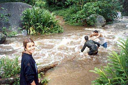 Andamos mais ou menos meia hora, distância que ele fez correndo, e chegamos a um rio que batia na canela, estranhei o fato de estar tão fraco aqui e tão forte lá em baixo, mas atravessamos. Logo apos umas folhagens vimos um outro rio mais largo e que batia na coxa, a união dos dois explicava o volume de água lá em baixo. Havia uns bambus colocados para auxiliar a passagem, pois mesmo ali a correnteza já estava forte e aumentava a cada hora.