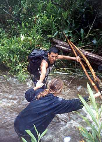 Depois desse rio, encontramos outro maior com mais ou menos um metro de altura e mais largo que se juntava aos outros dois, dessa vez não havia bambus para ajudar e tivemos que fazer uma corrente, dando as mãos.