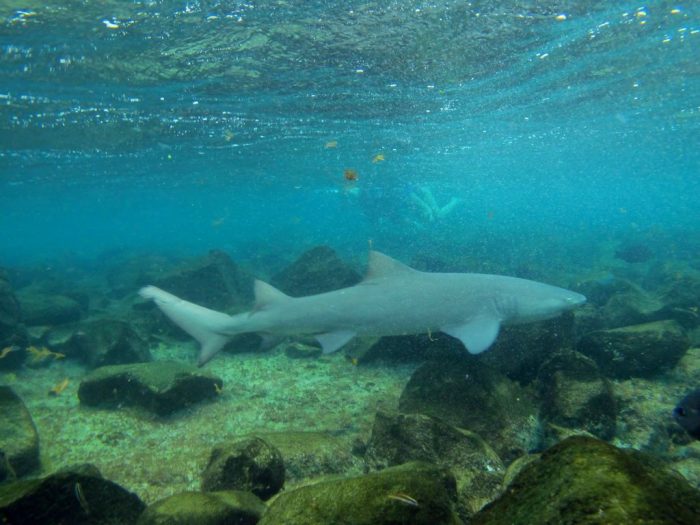 É um berçário natural e cheio de vida. Muitos cardumes de peixes, tartarugas se alimentando e agora de janeiro até março ela se torna o berçário perfeito para os filhotes de tubarões da espécie limão. Eu já mergulhei com mais de 12 filhotes lá! Super tranquilos, eles até ficam em volta de nós rondando para ‘ver’ quem é. Claro, alguns maiores também entram na piscina.