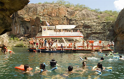 A trilha sonora no catamarã é eclética, transitando por forró, MPB e músicas regionais. Logo, a Pedra do Gavião é avistada. Trata-se de uma formação de rochas graníticas com o formato da cabeça da ave. No itinerário não se observam povoações, apenas um ou outro acampamento de pescadores. Algum tempo depois, chega-se à Gruta do Talhado, com parada de uma hora para banho nas águas límpidas e verdejantes do Rio São Francisco, com 22º C de temperatura média.