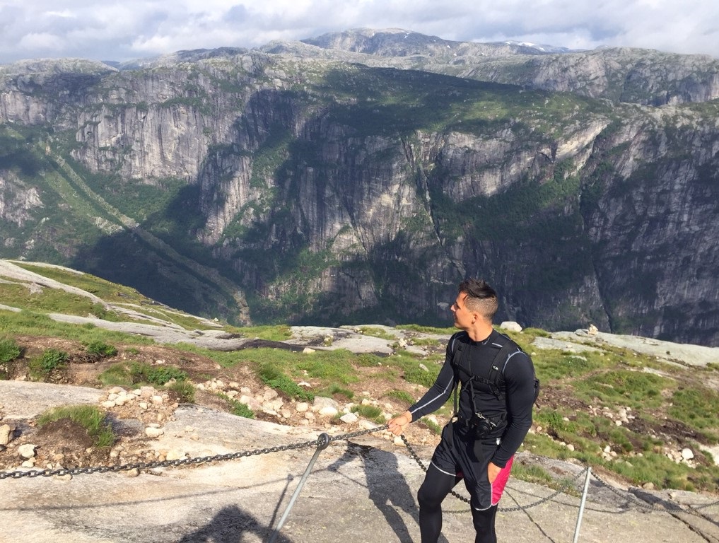 Depois de 1h50min, cheguei na tão famosa Pedra Suspensa. Os 10m finais estava coberto de neve, e brinquei com as pessoas que estavam tirando foto pra ter cuidado, pois aquela parte estava mais perigosa do que em cima da pedra em si. Assim que cheguei na fila, escutei de uma italiana que ela ficou com medo quando estava em cima da pedra, e o namorado dela me aconselhou a não olhar pra baixo. Confesso que antes de subir na pedra, olhando para baixo dá muito medo pois é muito alto (cerca de 1000m), porém quando estava na pedra não tive medo algum.