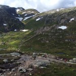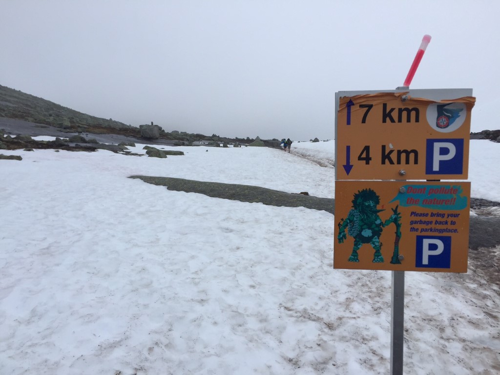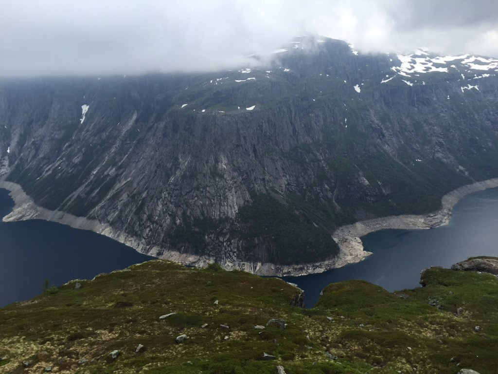 O tempo variou bastante nesse dia, sol entre nuvens, completamente nublado, e neblina. A vista do fiorde era incrível!! Três cachoeiras, neve e o lago do fiorde formavam um cenário inacreditável!! Fiquei surpreso com esse cenário, pois só tinha visto fotos das pessoas em cima da pedra, mas nem imaginava que tinha essas quedas d’Água. Não resisti e sentei na beira do fiorde outra vez, para contemplar a paisagem e tirar fotos. O engraçado foi que a adolescente que pedi pra tirar minha foto estava morrendo de medo, enquanto eu sentado na beira do fiorde não tinha medo algum. Depois do break pro lanche e pra descansar um pouco, fiz o caminho de volta com o casal de italianos. Contemplando a paisagem, tirando fotos, bebendo água potável diretamente da fonte, e conversando sobre viagens e lugares que já visitamos, foi o tom da volta.