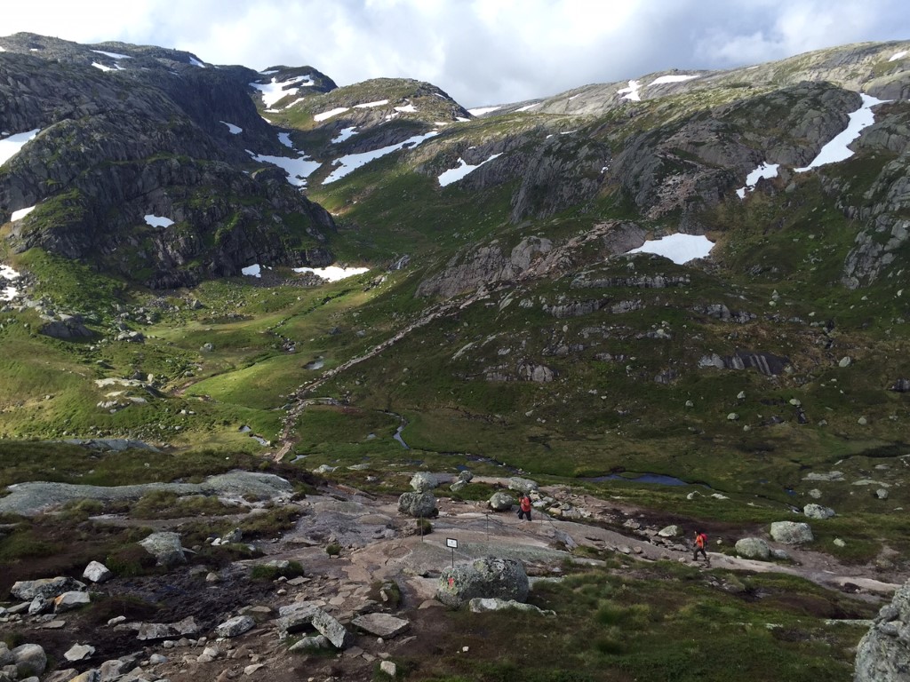 A trilha não é fácil. Cheia de subidas e descidas, algumas vezes andando em degraus, outras cruzando lençóis de água provenientes das cachoeiras. Tanto nas subidas quando nas descidas, as correntes presas ao solo ajudavam bastante. A trilha é marcada com um T vermelho em várias rochas. Aliás, rochas é o que mais se vê nesse trilha. As vezes tinha a impressão de que estava andando na superfície lunar. A recompensa vinha quando se aproximava da beirada das montanhas e via o fiorde. A vista é de tirar o fôlego!!! Nunca esquecerei quando cheguei na ponta de um fiorde pela primeira vez, tão alto tão alto, que o medo de cair, a adrenalina, e a vista te dão uma sensação que é difícil de explicar…. eu soltei um “uau” e abrir um sorriso de criança. Não podia deixar de registrar esse momento.