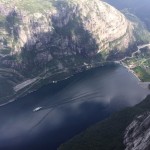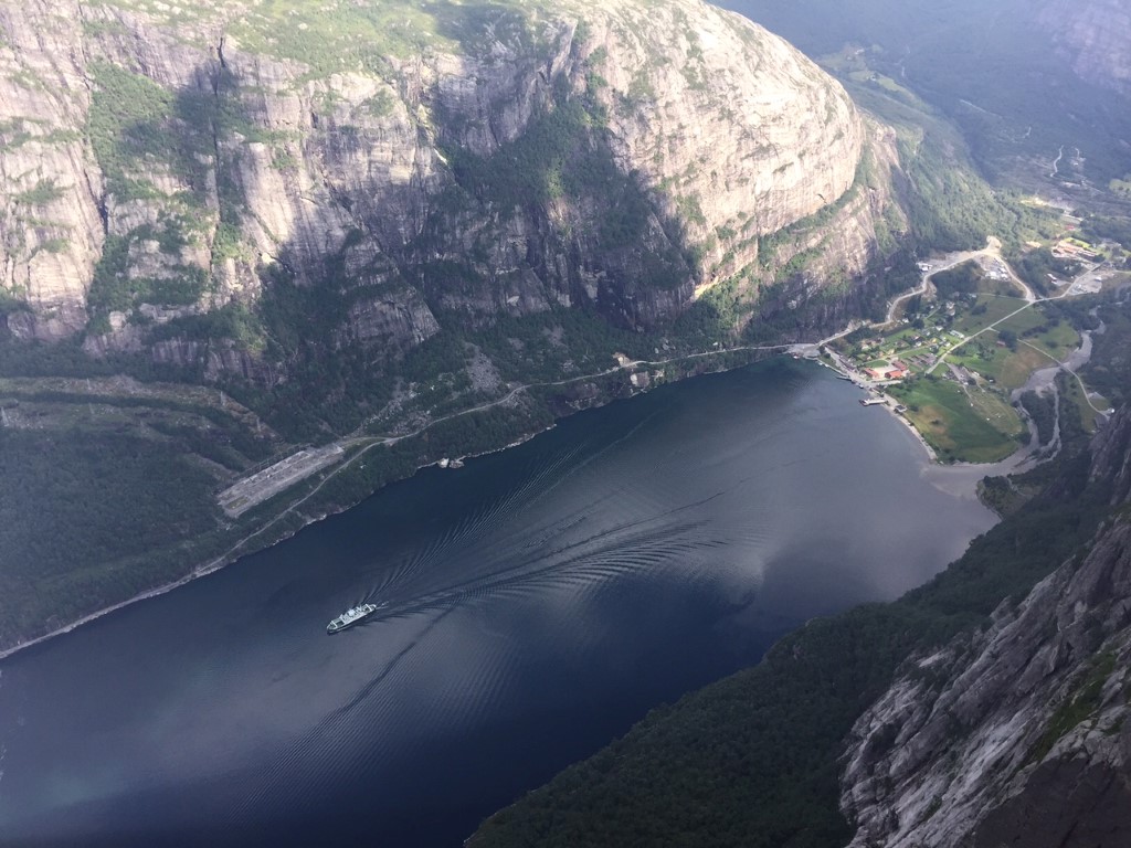 A imensidão do fiorde, é algo que te deixa boquiaberto. De cima do Pulpit Rock, você tem uma vista de 180 graus, de pura obra divina. Você não consegue nem imaginar onde o fiorde começa, e onde termina. O sol deixava o lago esverdeado, e tudo muito mais bonito. O legal do Pulpit Rock é que tem uma área bem grande pra você ficar e apreciar a vista.