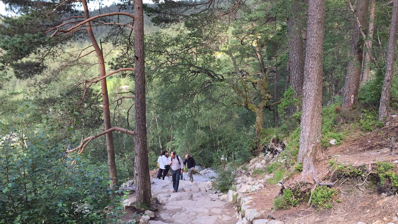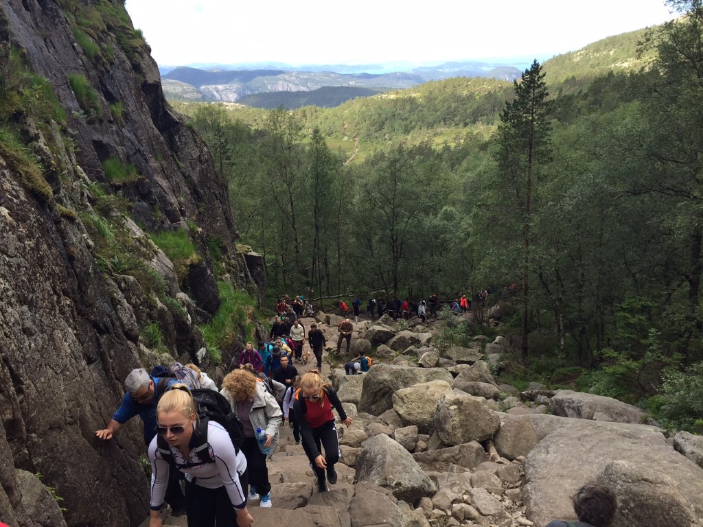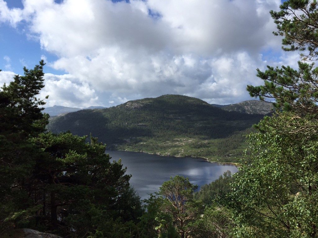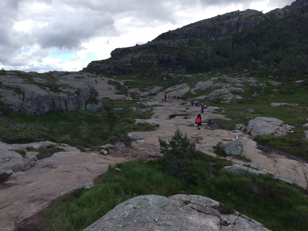 Logo do começo percebi que a trilha seria super diferente, várias árvores no caminho, um grande lago era visível quando olhava para trás, e até a trilha em si era mais fácil. O único detalhe é que eu não fui o único que decidi aproveitar esse dia lindo pra conhecer um dos pontos turísticos mais famosos da Noruega. Muita gente, gente de todas as idades, de crianças de colo a idosos, e até mesmo cachorros (que por sinal vi em todas as trilhas) estavam lá.