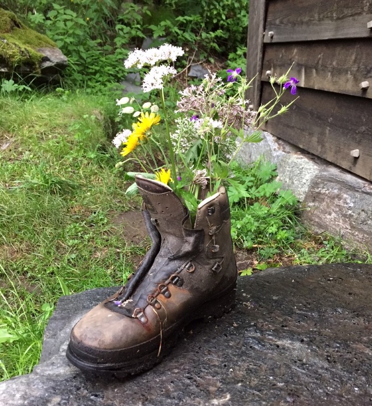 No começo da trilha, tinha tirado uma foto de uma bota, que fizeram um jarro de flores. Achei tão bonito e tão simbólico aquilo que resolvi fazer de troféu por alguns instantes. Pedi a Anna que segurasse o troféu para uma foto deles, e depois fiz o mesmo.