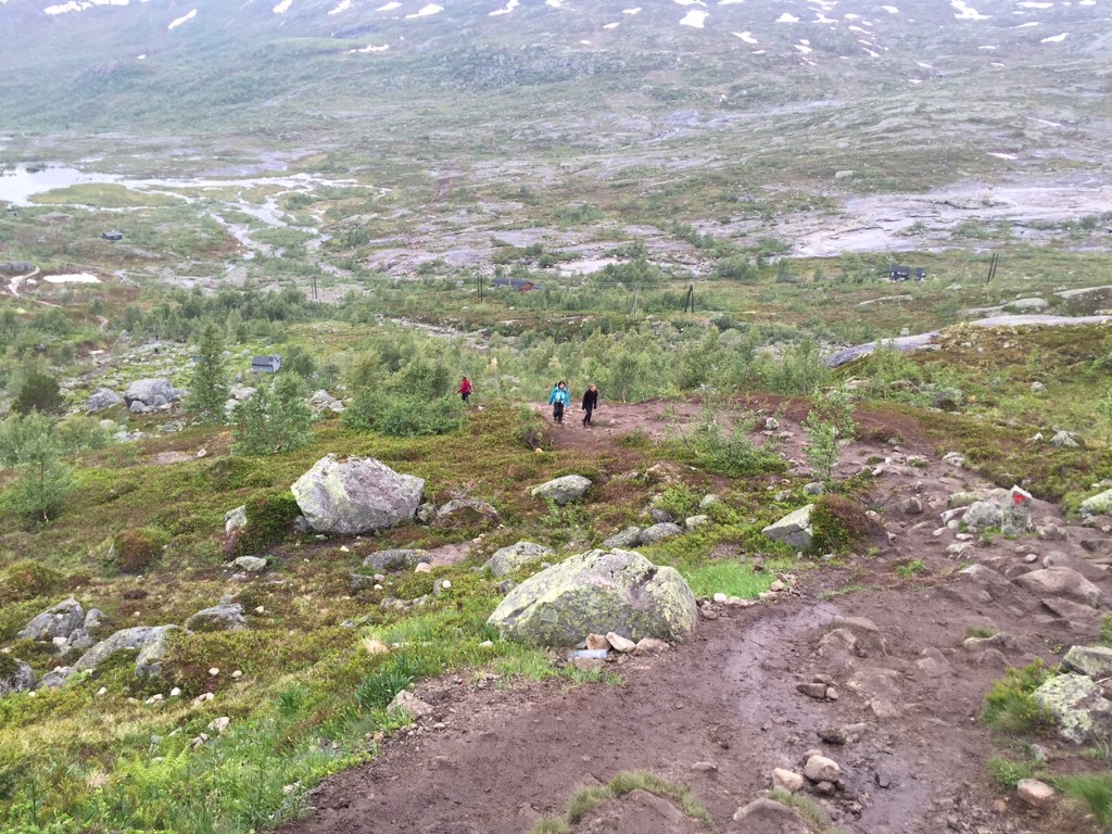 Comecei o primeiro quilômetro da Trilha de Trolltunga perdendo todos eles de vista, a euforia era grande. Mas o lamaçal e um subida super inclinada, me deram um banho de água fria. Não sabia onde por o pé, tudo era lama. Até corda que servia para nos apoiar e marcar a trilha estava toda suja de lama. Em vários pontos os degraus ainda eram visíveis, outros só as pegadas das pessoas. Respirava ofegante e pensava, se o primeiro quilômetro era daquele jeito nem queria imaginar o resto. Em segundos vi o pai da menina rodar em plena minha frente e cair de bunda na lama, em meio a gargalhada dela, noutro segundo atolei meus pés na lama, um de cada vez. Conheci um casal da Alemanha e o rapaz de aproximadamente 24 anos me disse que o primeiro quilômetro era o pior. E de fato foi.
