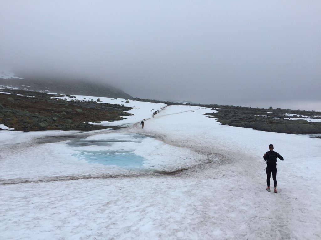 A euforia era grande!! Sentia minha perna como não tinha sentido nos 10Km anteriores, tivemos algumas subidas e até corremos no gelo, mas estávamos tão alucinados que perdemos a trilha e quando vimos já estávamos de cara com o ponto culminante da trilha: Trolltunga. A sensação de estar naquele lugar é algo difícil de por no papel. Todo o esforço, 11Km em 4h20min com certeza valeram a pena. Trolltunga realmente não leva a fama à toa.