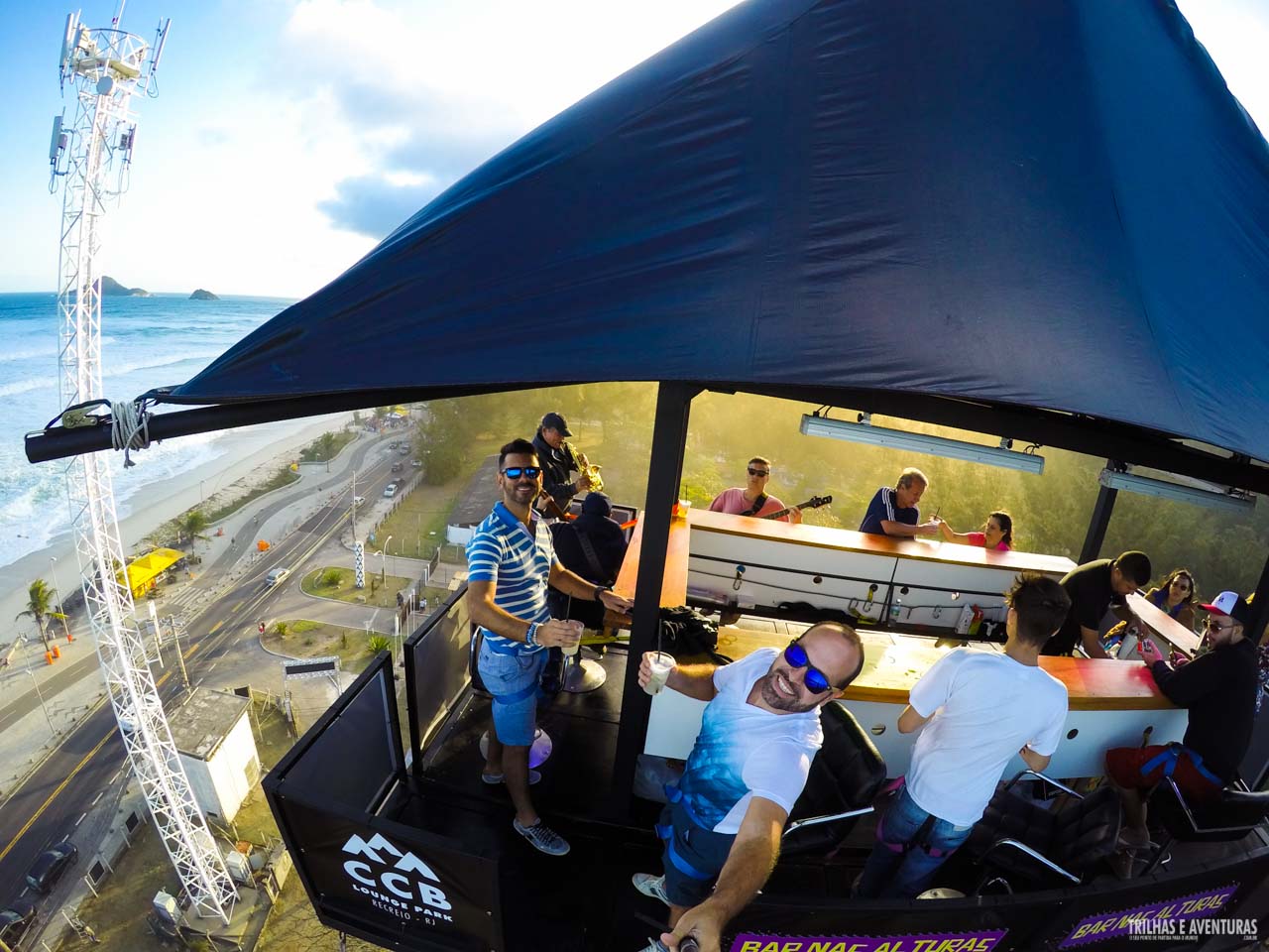 O Bar das Alturas, grande estrela do evento, terá 20 metros quadrados e atenderá 10 pessoas por vez. A permanência será de 10 a 15 minutos por grupo. Para ter acesso ao bar, o guindaste descerá com a estrutura até o nível do chão onde os clientes “embarcam”. Por lá cada participante ganhará um drink. O ponto alto da atração fica por conta da vista deslumbrante da praia da Macumba, onde será possível avistar a Pedra da Gávea, Lagoa da Reserva, Pedra do Pontal e assistir a um belíssimo Pôr do Sol.