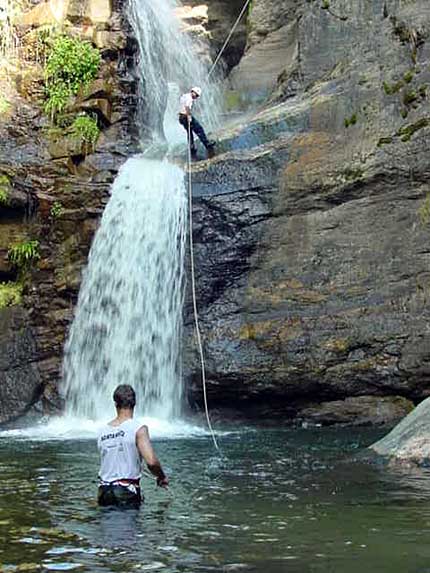 A descida do rapel desta cachoeira é encantadora. Tem-se uma vista panorâmica de todo o Vale do Guapiaçu e nos dá uma impressão de plena liberdade misturada com a sensação do medo. Logo nos primeiros metros sentimos a água desabando sobre nossas cabeças como se fosse nos matar sufocados, mas logo após recompomos a energia e descemos tateando as pedras como algo infinito.