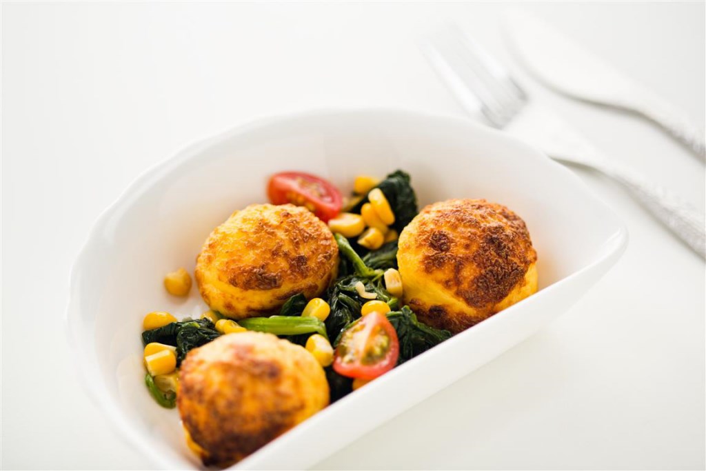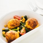 Omelete com requeijão, servida com espinafres salteados com milho verde.