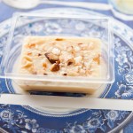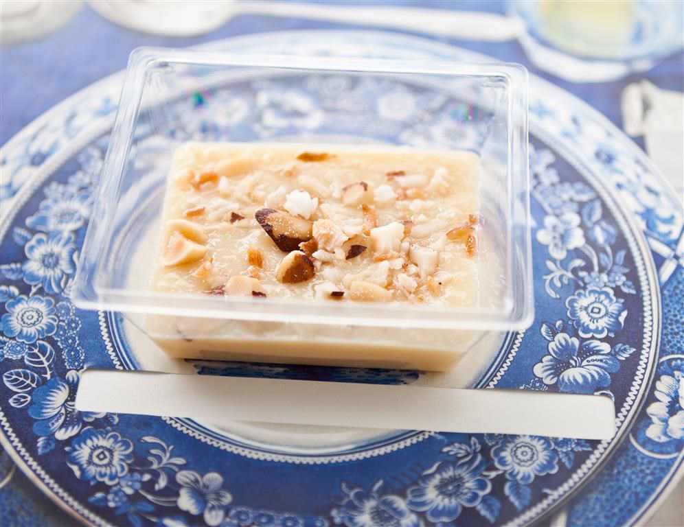 Cocada cremosa, servida com castanha do Pará e coco queimado.