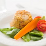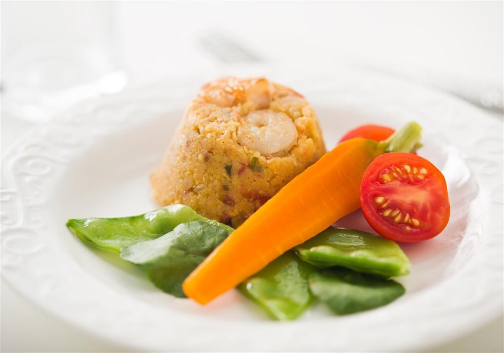 Prato típico do sudeste brasileiro, cuscuz de milho com camarão, legumes salteados e capuchinha.