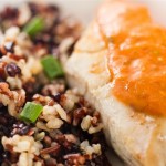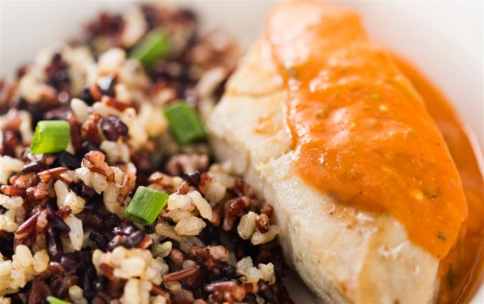 Pintado no molho de coco com tomatinho, cebola pérola e pimenta cambuci, servida com mix de arroz e castanha de caju