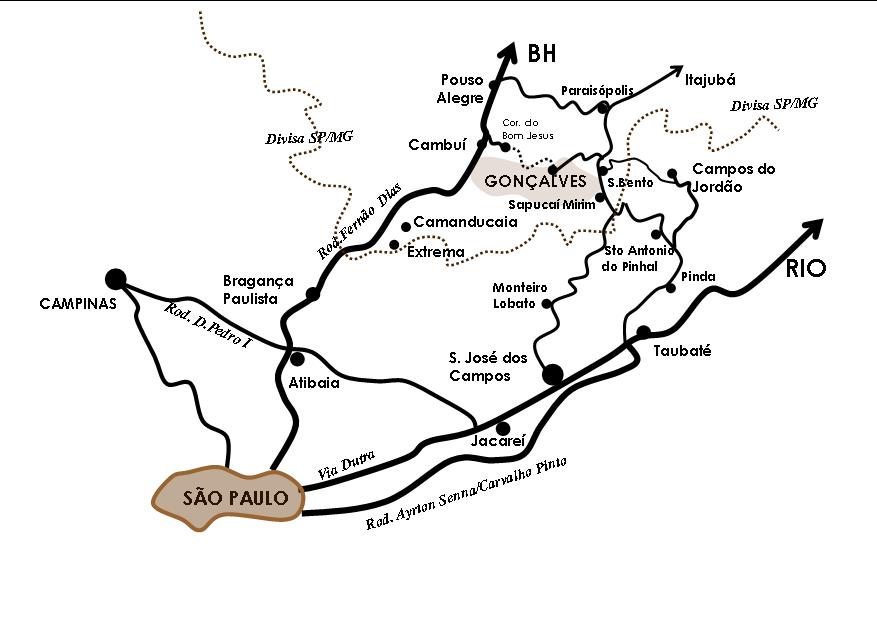 De SP a distancia é de 231 km. Siga pela Rodovia Fernão Dias até a entrada para Camanducaia, em direção a Monte Verde. Pegue a estrada para Sapucaí Mirim e daí siga as placas para Gonçalves.