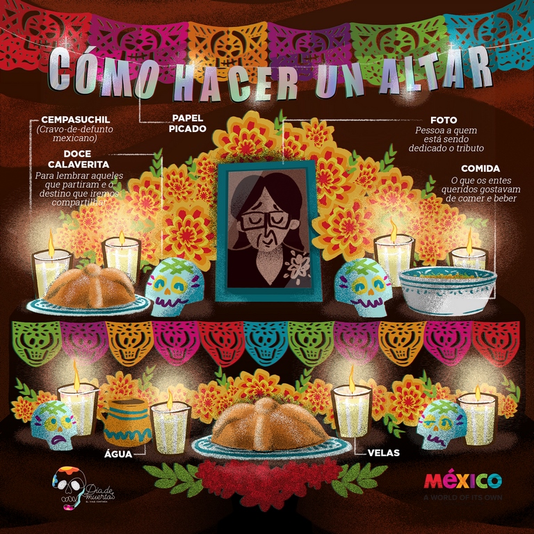 O altar para o Dia dos Mortos no México também pode ser adornado com papel picado, tecidos de seda e cetim, onde figuras de argila, ou roupas limpas dos mortos também ficam para receber as almas. O altar para os mortos serve para que possam beber, comer, descansar e viver mais um breve momento com seus parentes e, por isso, é uma grande celebração.