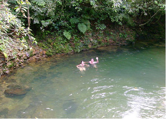 Nos programamos para acordar tarde e aproveitar um pouco da manhã na piscina, mas as 9h da manhã o Jaime já nos chamava para irmos ao Salto Morato. Não pensamos duas vezes e logo estávamos tomando nosso café da manhã e nos preparando para o passeio. O Salto Morato é uma cachoeira que fica dentro de uma reserva mantida pela Fundação O Boticário. Antes a região era degradada e ali existia uma fazenda. Em 1994 foi adquirida pela fundação e passou a ser uma área de preservação ambiental. A cachoeira impressiona por sua altura, são aproximadamente 100m de queda. Para se alcançar esta cachoeira, são 1500m de trilha, em uma caminhada muito tranqüila e bonita. Um lugar que vale a pena conhecer. Entre a entrada do parque e a cachoeira, passamos por um “aquário natural”, onde é impossível não entrar um pouco e aproveitar a água cristalina, onde os peixes vem brincar a nosso redor.