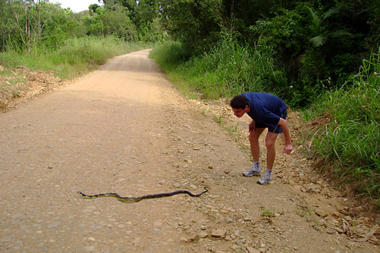 O retorno para Curitiba foi muito tranqüilo. Conhecemos a estrada que liga Guaraqueçaba a Antonina, outra região histórica do Paraná. Passamos pelo mirante, onde tivemos uma linda vista de toda a mata atlântica que cerca Guaraqueçaba e um pouco a frente tivemos o prazer de encontrar uma linda Cobra Caninana na estrada, onde paramos para fotografá-la e tirá-la da estrada para que não fosse atropelada.