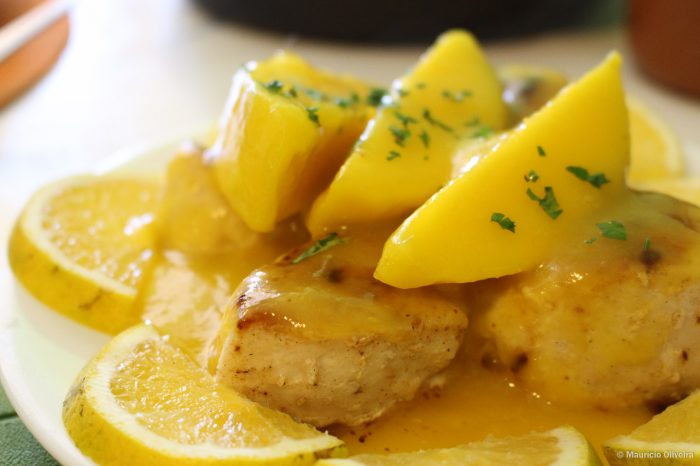 Nossas opções foram o Peixe Grelhado ao Molho de Manga e o Peixe Frito com batatas, que vieram acompanhados de arroz, salada e uma farofa de coco simplesmente dos deuses.