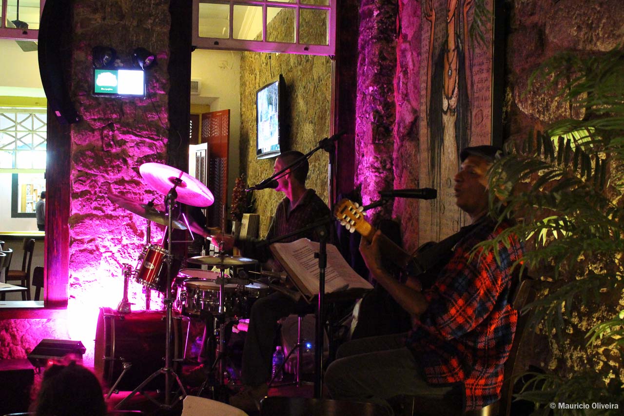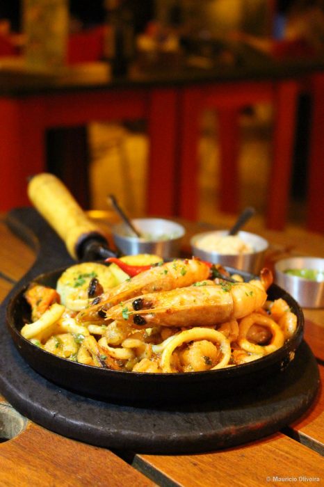 Harmonizamos nossos drinks com o carro chefe da casa, o Mix do Mar. Um prato de grelhados com camarões, lulas e mexilhões puxados no alho e azeite, com molhos especiais e pães. A farofinha e o molho de pimenta biquinho estavam especialmente deliciosos.