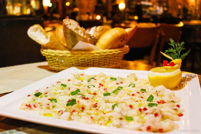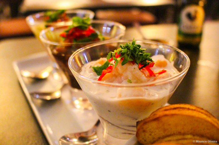 A nossa experiência nesse restaurante foi ótima, na entrada pedimos a degustação de três tipos de Ceviches: Robalo, Atum e Camarão. Uma combinação perfeita em caso de dúvidas para escolher apenas um. Experimentamos também um dos drinks mais tradicionais de Paraty, o Jorge Amado, que é feito com limão, maracujá e cachaça Gabriela, que é uma cachaça típica da cidade elaborada com cravo e canela.
