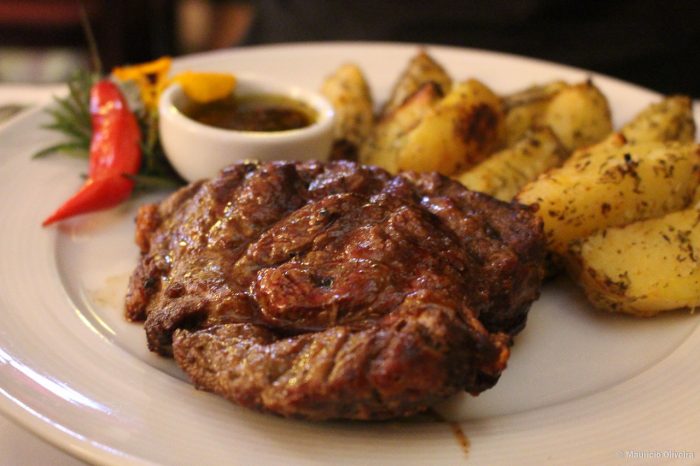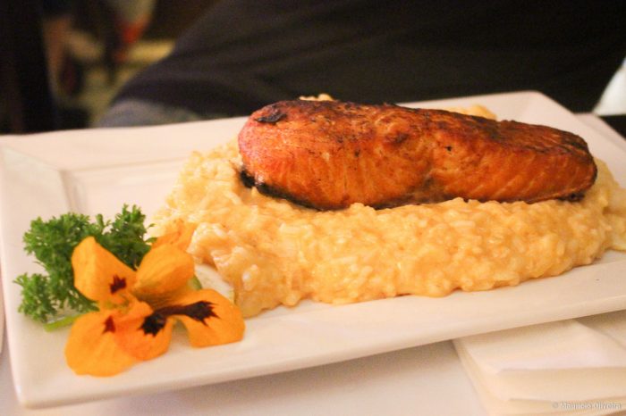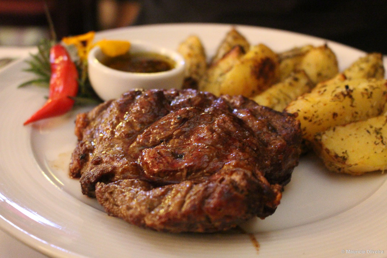 Os pratos principais degustados durante nosso jantar foram: Entrecôte com Batatas Rústicas e Salmão Grelhado com Risoto de Palmito. Esses pratos são muito bem servidos e satisfazem perfeitamente duas pessoas. Estavam maravilhosos e suavemente bem temperados.