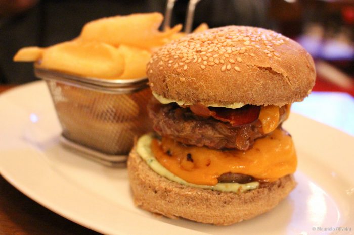 Mas voltando aos hambúrgueres artesanais, eles variam entre R$22 e R$28, um preço bastante justo, pois todos vem com fritas rústicas e uma apresentação bacaninha. Cada um de nós pedimos um diferente: La Cheddar – hambúrguer 150g, queijo cheddar, alface e tomate, La Santa – hambúrguer 150g, gorgonzola, rúcula, e cebola e maçã caramelizadas, La Maldita – hambúrguer 150g, queijo, bacon, tomate e alface com molho picante.