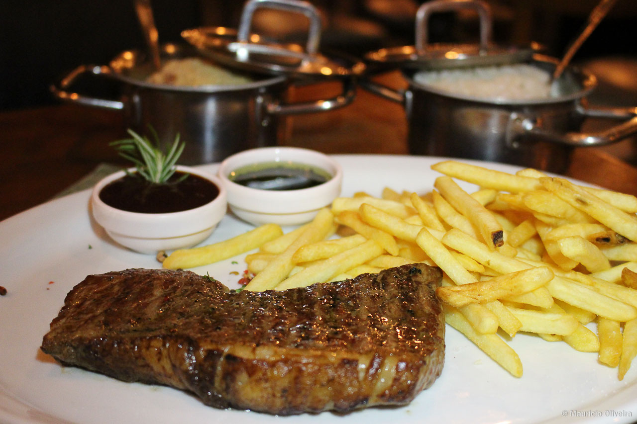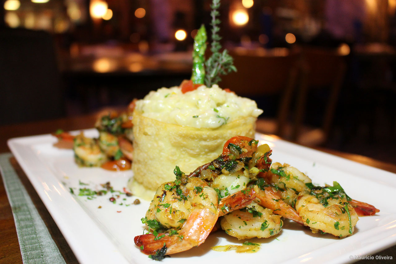 Os pratos principais foram o Steak (miolo de Picanha, farofa grill, arroz, fritas, molho barbecue e chimichurri) e Camarões Grelhados com Risoto de Aspargos Frescos, que estavam uma maravilha. O risoto vem dentro de uma casca crocante que o mantém quente durante toda a refeição. Foi muito especial.