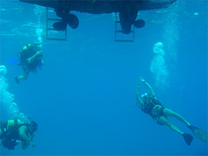 O centro de mergulho pertence ao governo, como tudo num país socialista. Nosso pacote já incluía saídas de mergulho, mas pra você ter idéia uma saída custa aproximadamente 20 Euros para cada cilindro. Com lanchas rápidas, nosso grupo se acomodou numa embarcação boa e com uma tripulação muito bacana.