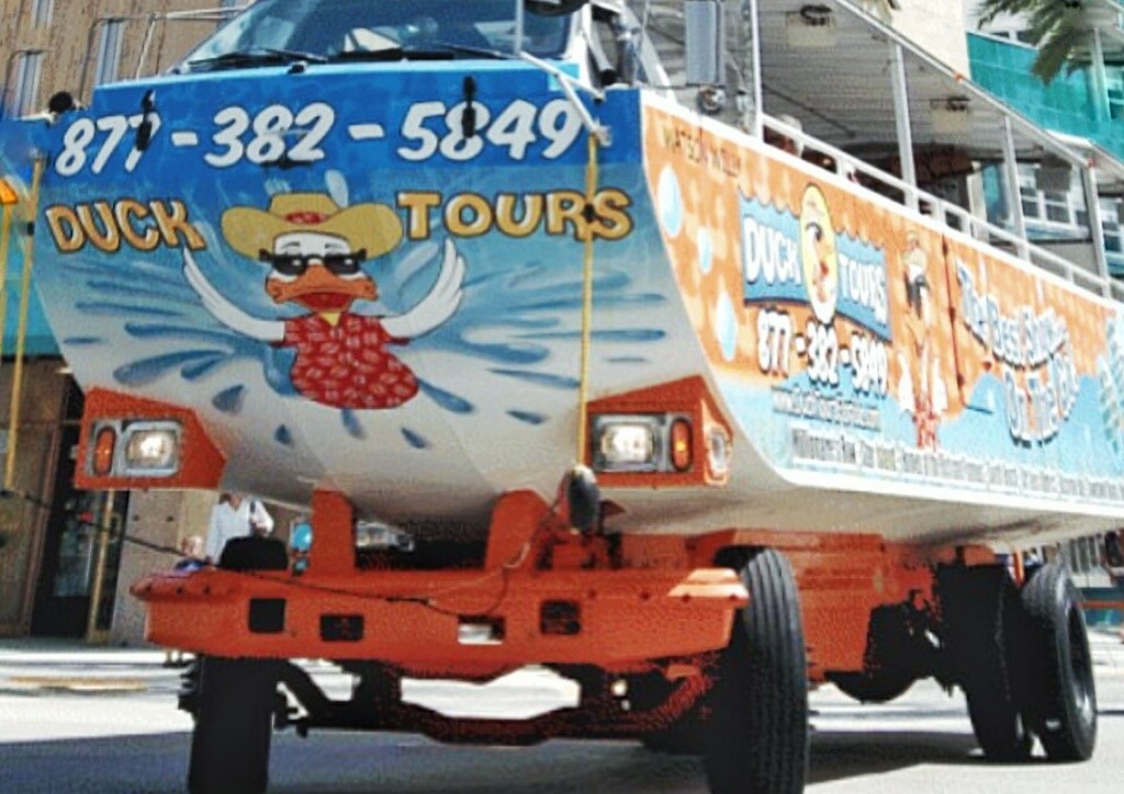 Um passeio com duração de 90 minutos em um ônibus anfíbio. É um passeio bem típico de turista, passear em um ônibus gigante pintado de pato a principio me pareceu uma furada mas valeu muito a pena. Saímos de Miami South Beach e percorremos as principais ruas como Ocean Drive, Lincoln Road, em seguidas o ônibus entra na orla e essa é a parte mais diferente e legal do passeio.