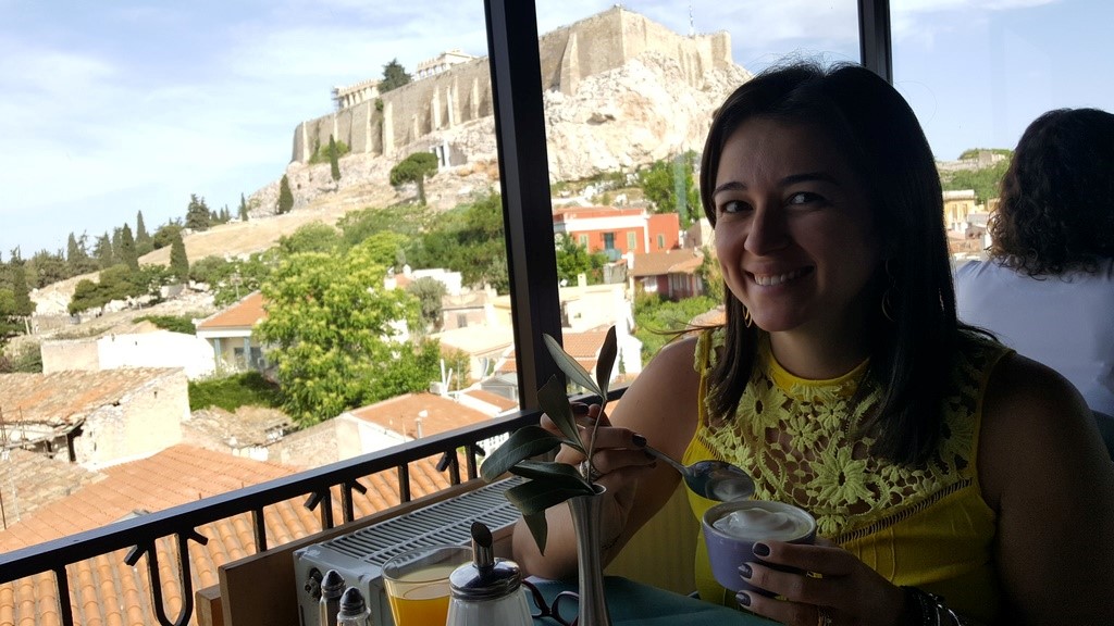 A região de Plaka é alegre, bem movimentada, cheia de turistas, policiamento, casinhas com arquitetura típica, restaurantes, lojinhas, bares e cafés. Achei que valeu muito a pena se hospedar por lá. Na primeira passagem por Atenas nos hospedamos no Hotel Byron, um hotel simples, mas aos pés da Acrópole, em uma rua bem movimentada. Eu adorei esse hotel e principalmente sua localização. O café da manhã era servido em um rooftop com uma linda vista da Acrópole e à noite era possível jantar por lá, com vista para a Acrópole toda iluminada, aberto também a não hospedes.