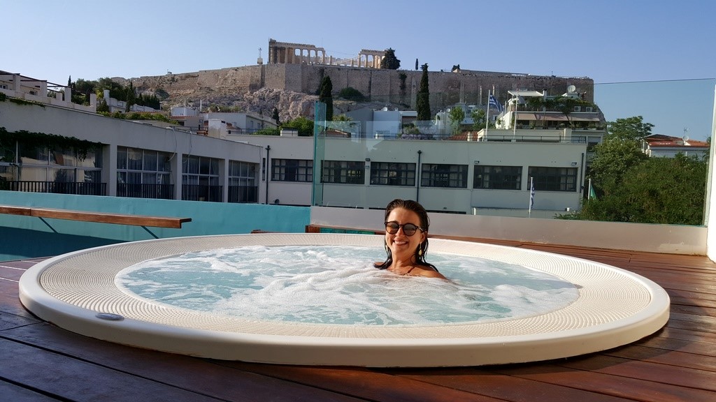 Na nossa segunda passagem por Atenas, resolvemos escolher um hotel um pouco mais confortável, pois a ideia era “descansar” da viagem antes de encarar o vôo de volta para o Brasil. Escolhemos o Hotel Herodion, também em Plaka. Apesar deste, ser bem mais luxuoso que o primeiro, era numa rua mais escura e não gostei do atendimento do hotel e principalmente do rooftop dele. A gerente era extremamente desagradável, o cardápio era restrito e caro, não achei que valia a pena jantar ali. Uma vantagem do Herodion é que ele tem uma hidromassagem no terraço, com água quentinha e vista para a Acrópole, foi uma delícia relaxar ali no final da viagem relembrando todos os bons momentos que tínhamos vivido naqueles dias.