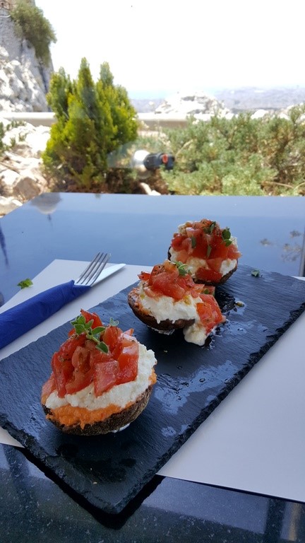 A comida no restaurante estava maravilhosa e o preço foi ótimo. Alexandre pediu um Souvlaki, típico “fastfood” grego, uma espécie de churrasquinho de frango servido com pão pita, salada, batata frita e molho tzatziki (a base de iogurte, pepino e alho, divino). Você não pode deixar de provar pelo menos um desse quando estiver pela Grécia. Já eu pedi um Dakos, uma espécie de “bruschetta” grega, um pão torrado, coberto por um delicioso queijo feta cremoso, tomates picados, azeitonas, azeite, orégano e um tempero maravilhoso que só os gregos sabem fazer.