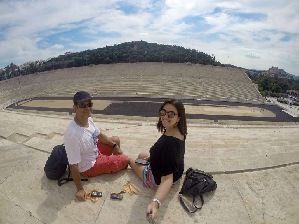 Quando descemos do Monte Lycabettus, caminhamos novamente margeando os Jardins Nacionais, até chegar ao Estádio Panatenaico. O ingresso para a visita custa €10,00 e foi um dos passeios mais legais que fizemos na cidade. O passeio é todo narrado em um áudio-guia, incluído no valor do ingresso, onde é possível se encantar ainda mais com a beleza e os segredos escondidos por trás do Estádio.
