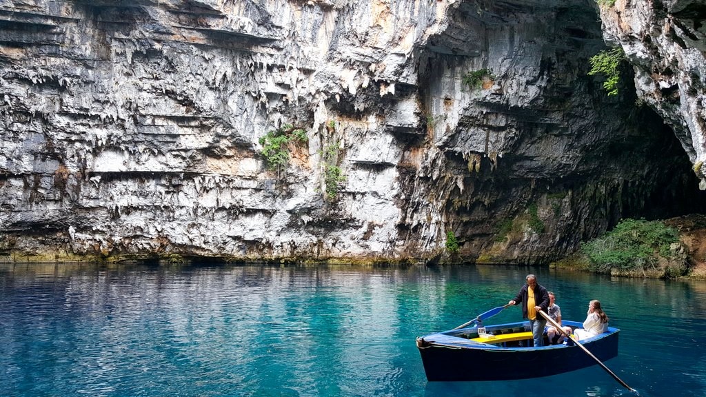 De lá seguimos nosso passeio para o vilarejo de Sami, para visitar a famosa Caverna Melissani. Diz a lenda, que a ninfa Melissanthi, era apaixonada pelo Deus Pã e por não ser correspondida nesse amor, cometeu suicídio no lago da caverna. Por causa de Melissanthi e de outras ninfas que habitavam a caverna, ela passou a ser chamada de caverna das ninfas! Verdade ou mentira, o fato é que a caverna tem uma atmosfera mágica, um lugar incrível, cheio de mistérios, que vale a pena a visita! O ideal é chega por volta de 12:00h, até umas 14:00H, período em que o sol está exatamente em cima da caverna, deixando a água do lago ainda mais azul! A visita é feita em pequenos botes, guiado por guias locais que contam as histórias do lugar. O passeio custa €7,00 e é bem rapidinho, uns 20 minutos no máximo.
