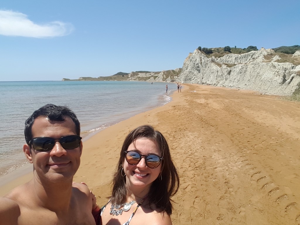 Tentamos procurar primeiro a Platia Ammos Beach. Na verdade o GPS indicou que estávamos nela, mas não tinha nenhuma descida até a praia, apenas conseguimos ver de cima de um despenhadeiro, tenho minhas dúvidas se de fato essa era mesmo a Platia Ammos, mas a verdade é que mesmo sem saber exatamente onde estávamos, a paisagem era de tirar o fôlego! Como essa região estava meio deserta e sem sinalização, com o sinal ruim do GPS, saímos de lá e fomos para a Xi Beach.