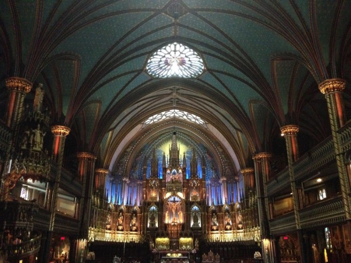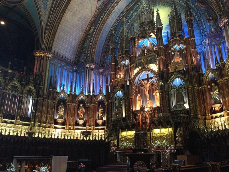 Old Montreal ou Vieux-Montréal (Montreal antiga): Ao chegar à estação central o primeiro local a conhecer foi esse bairro incrível e ele é justamente o ponto de partida para conhecer o restante da cidade. Repleto de prédios antigos e com arquitetura clássica do século XVIII, mantém as características da época bem vivas o que proporciona um ambiente charmoso e muito agradável. Um passeio a pé pela Rue Saint Paul Ouest e visitar a Catedral de Notre Dame são dicas imperdíveis, literalmente. A Catedral, que fica na frente da Place d’Armes square, é uma das mais lindas do mundo e também é considerada um dos símbolos mais importantes de Old Montreal, com estilo Gótico e detalhes em azul, ouro e prata. A entrada custa cinco dólares canadenses e é possível fazer uma visita guiada (de acordo com os horários estabelecidos no local). Outro lugar imperdível é a Place Jacques Cartier, uma grande calçada com restaurante e pintores de rua bem em frente ao imponente Hotel de Ville de Montréal;