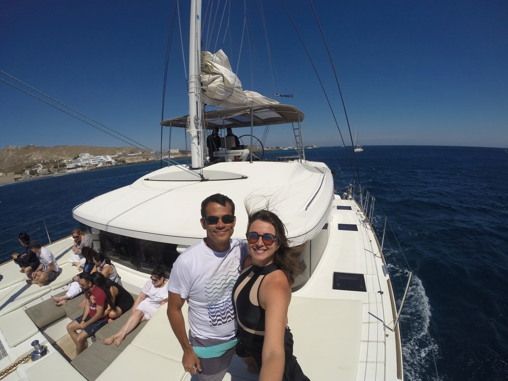 No nosso primeiro dia em Santorini, assim que deixamos as malas no hotel e pegamos todas as dicas da ilha com a Ana, partimos para o primeiro passeio: um cruzeiro pelas principais praias da ilha. Fechamos o passeio ainda do Brasil, com a agência Santorini Yachting Club. Nós fechamos com antecedência, pois esse dia era nosso aniversário de casamento e eu não queria correr o risco de perder o cruzeiro, afinal, não é todo ano que se comemora em Santorini.