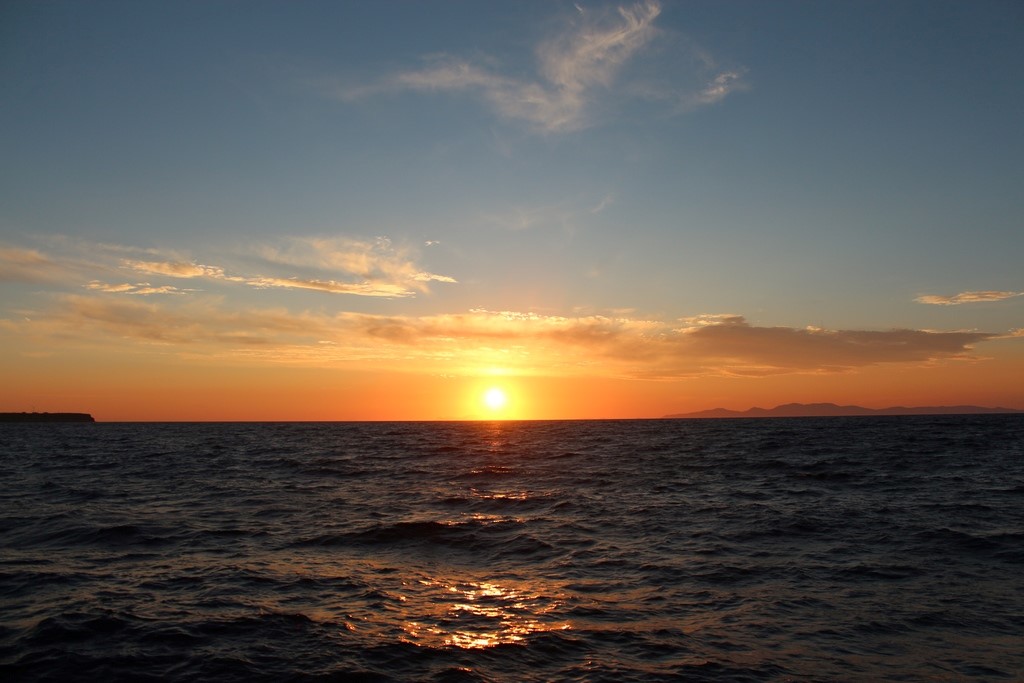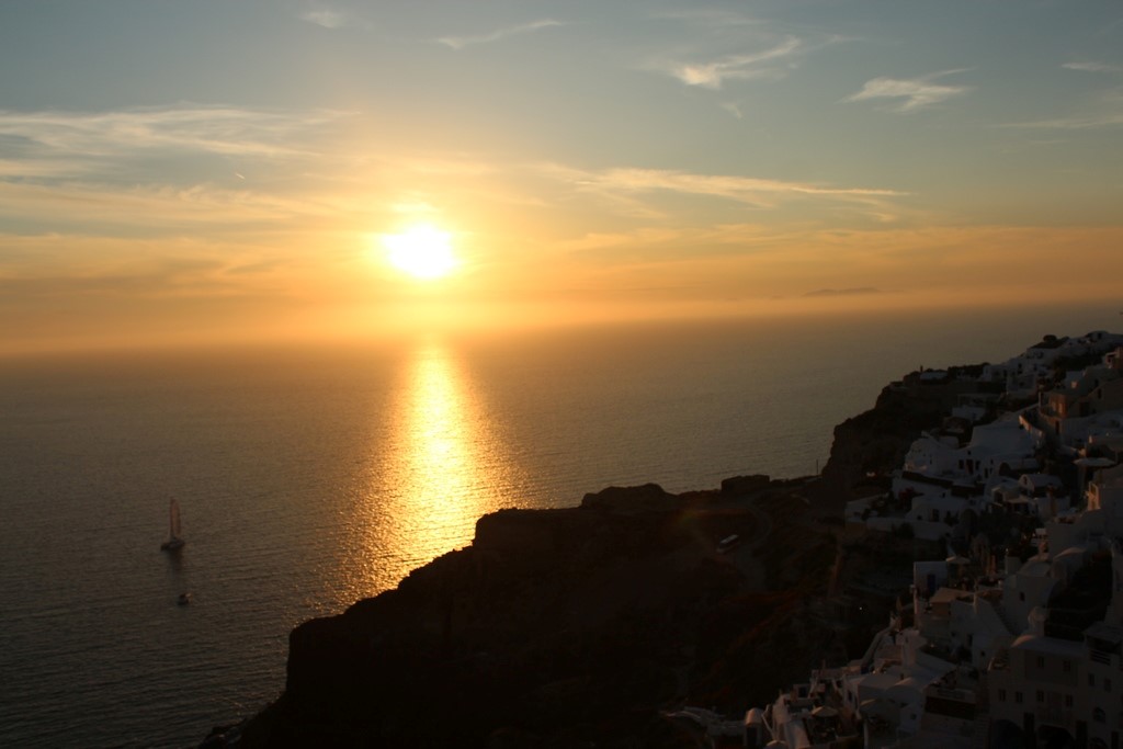 Pôr do sol visto do barco, momento imperdível em Santorini