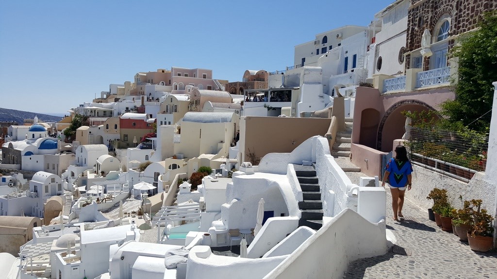 Prepare-se também para um bom exercício físico, pois nesse passeio tem muitas escadas, quase tudo beirando a encosta envolve descidas e subidas, vá com calçados confortáveis e leve bastante água, o calor realmente é de matar! A Ana, dona do nosso hotel, nos deu um mapinha, com as dicas de cada ruazinha pra entrar, que saíam em lugares com aquelas vistas clássicas de Santorini. Mas caso você não tenha uma Ana pra te ajudar, não tem problema, entre em cada uma das ruas a esquerda da rua principal que a vista vai ser linda!