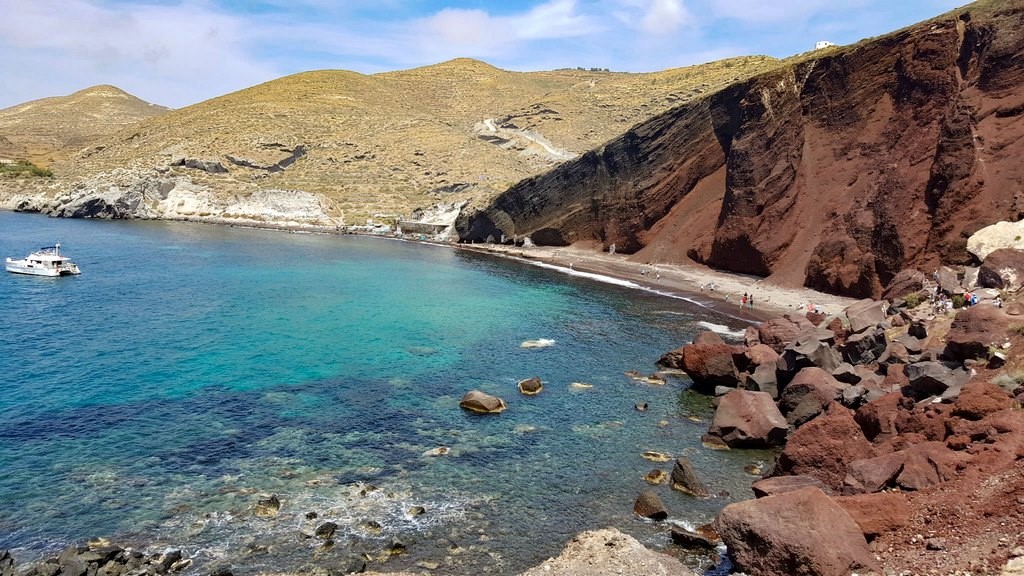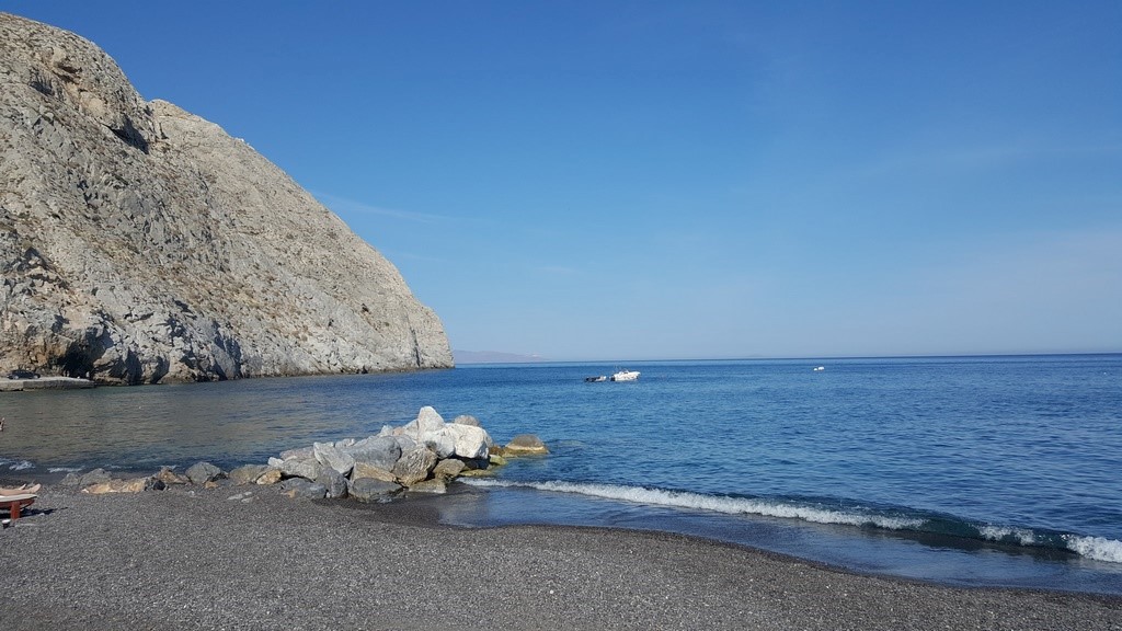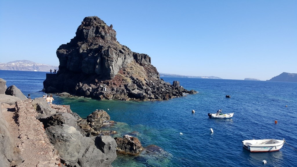 Saindo de Akrotiri, fomos para a praia. Santorini é o resultado de várias erupções repetidas. O litoral interior em torno da caldeira é um precipício de mais de 300 m de queda e apresenta as várias camadas de lava solidificada uma em cima da outra.