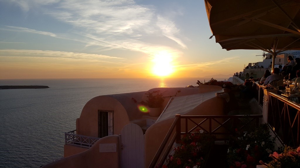 Eu particularmente prefiro ver o pôr do sol numa praia, sentada numa pedra, em algum lugar mais “livre”, mas como em Santorini, especialmente em Oía, isso é meio impossível, pois os melhores lugares para assistir ao sol se pondo ficam abarrotados de gente desde cedo, decidimos pelo menos um dia assistir de um restaurante, de maneira mais privativa.