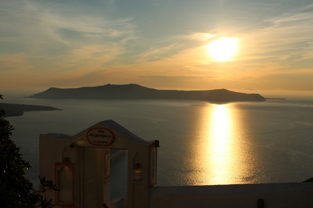 Saindo de Perissa, pegamos novamente um ônibus e fomos assistir ao pôr do sol em Fira. Dessa vez consegui assisti do jeito que eu gosto, achei um banquinho vazio, de frente para o sol e ainda tinha um grupo tocando violino ao fundo, foi perfeito! Estava bem mais vazio que em Oía e isso me fez gostar até um pouco mais do pôr do sol lá em Fira.