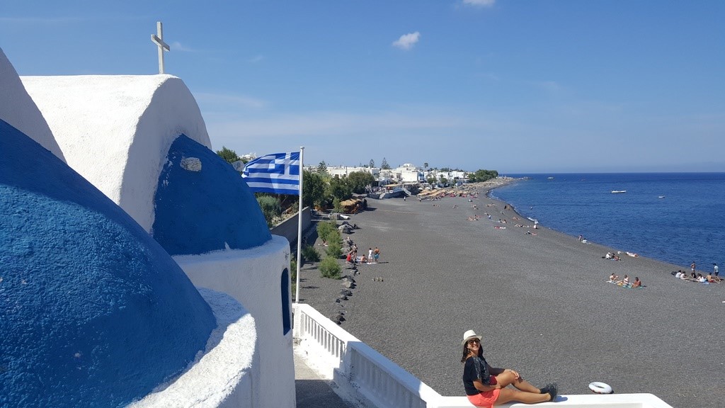 Então, como o calor estava grande, pegamos um ônibus na rodoviária de Fira e fomos para uma Black Beach, a Perissa Beach. É Muito fácil andar de ônibus lá. Todas as linhas saem dessa rodoviária de Fira e tem o nome da cidade de destino. É possível checar o horário de saída dos ônibus na rodoviária. Nós andávamos com foto da tabela de horários e era bem tranquilo. O ônibus te pega no mesmo ponto onde te deixou.