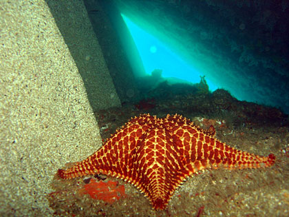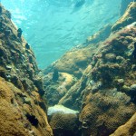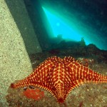 Um dos grandes mergulhos que fiz em termos de beleza de fundo de mar foi na Laje Alagada. Além de muitas estrelas, grandes pedras abrem fendas onde é possível descobrir passagens que nos apresentam grandes salões de areia branca repleto de estrelas do mar.