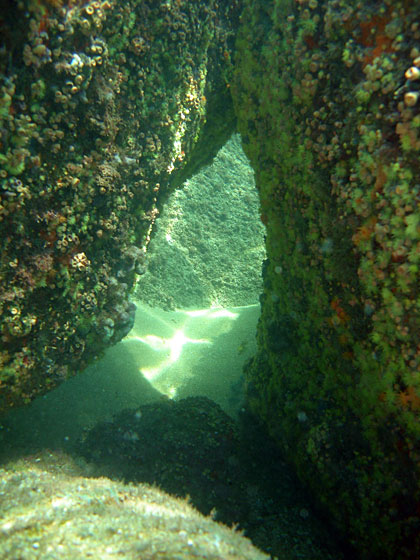 Deve-se evitar o mergulho quando a maré está enchendo, pois o mergulhador é “jogado” contra as pedras. Depois de um pequeno percurso de no máximo 20 metros chega-se ao salão, onde é possível tirar a máscara, já que existe uma chaminé por onde ocorre a ventilação da gruta. Há uma grande quantidade de pequenos peixes no seu interior, porém o espetáculo mais bonito é a saída quando podemos ver a claridade vinda da superfície.